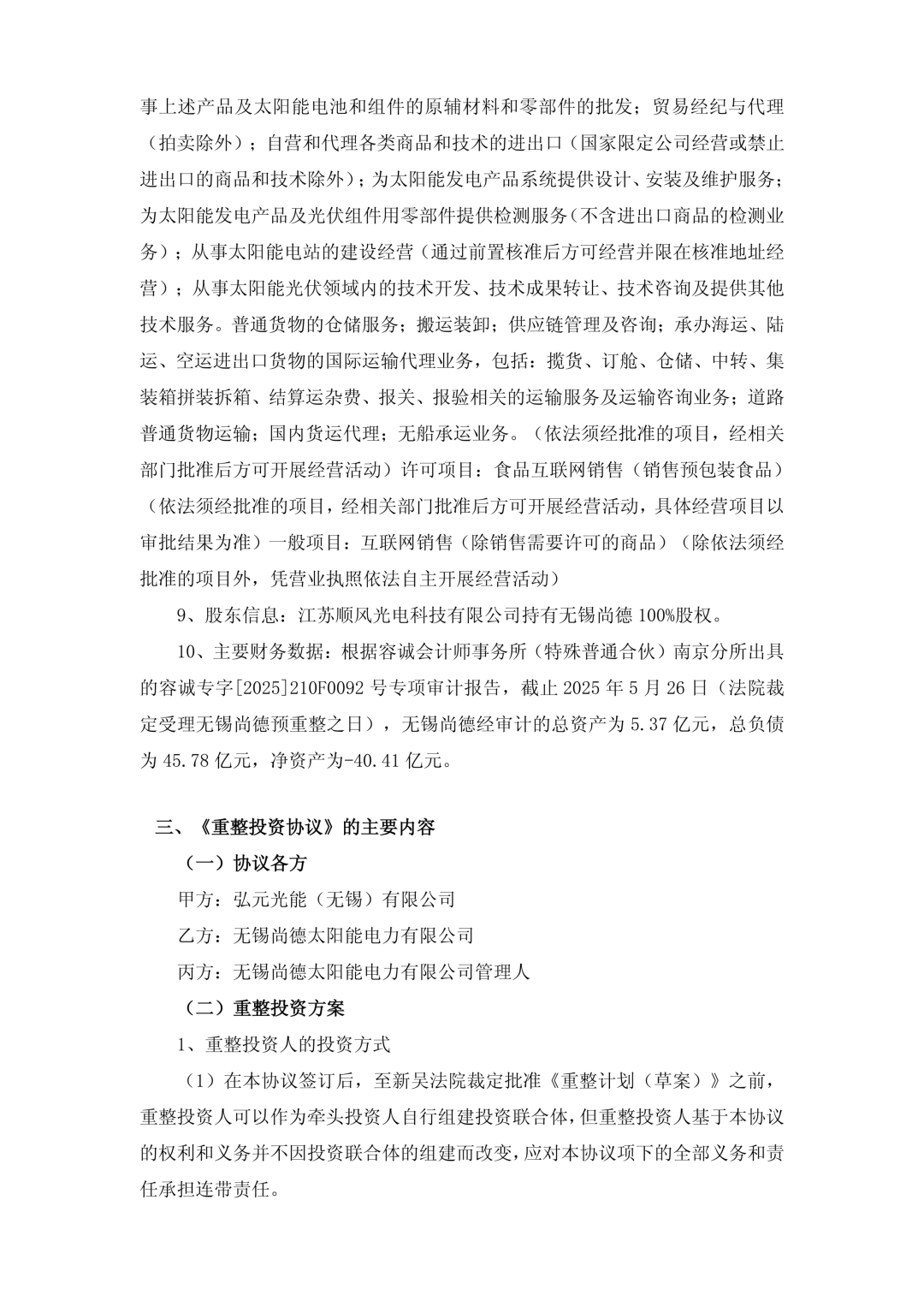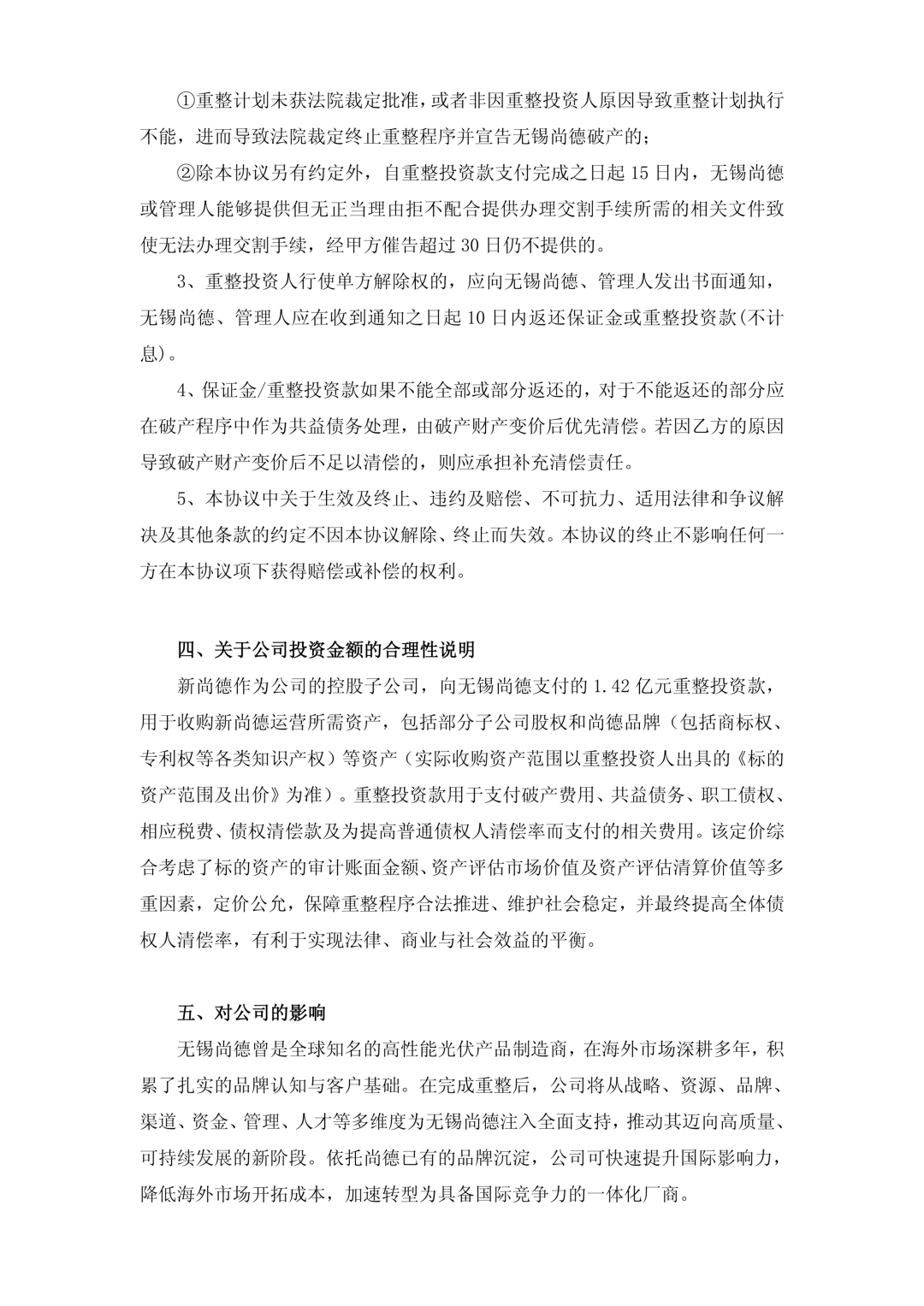 公司本身已布局覆盖硅料、硅片、电池、组件的全产业链,在规模与成本控制方面具备优势,而无锡尚德在光伏行业深耕多年,拥有相应的技术积累和市场经验,两者业务具有高度匹配性与协同性,若本次重整成功,公司将依托自身的产业实力、资金储备、技术人才及管理经验,与新尚德实现产业链纵向深度融合,进一步增强供应链的稳定性与整体效率,从而全面提升公司的盈利能力和抗风险水平。