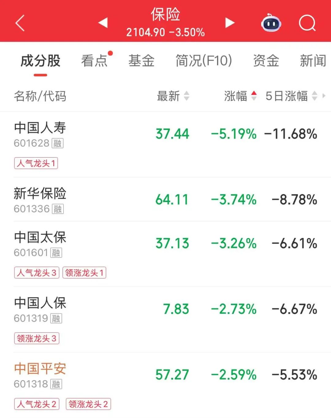 保险股下挫,中国人寿跌逾5%。