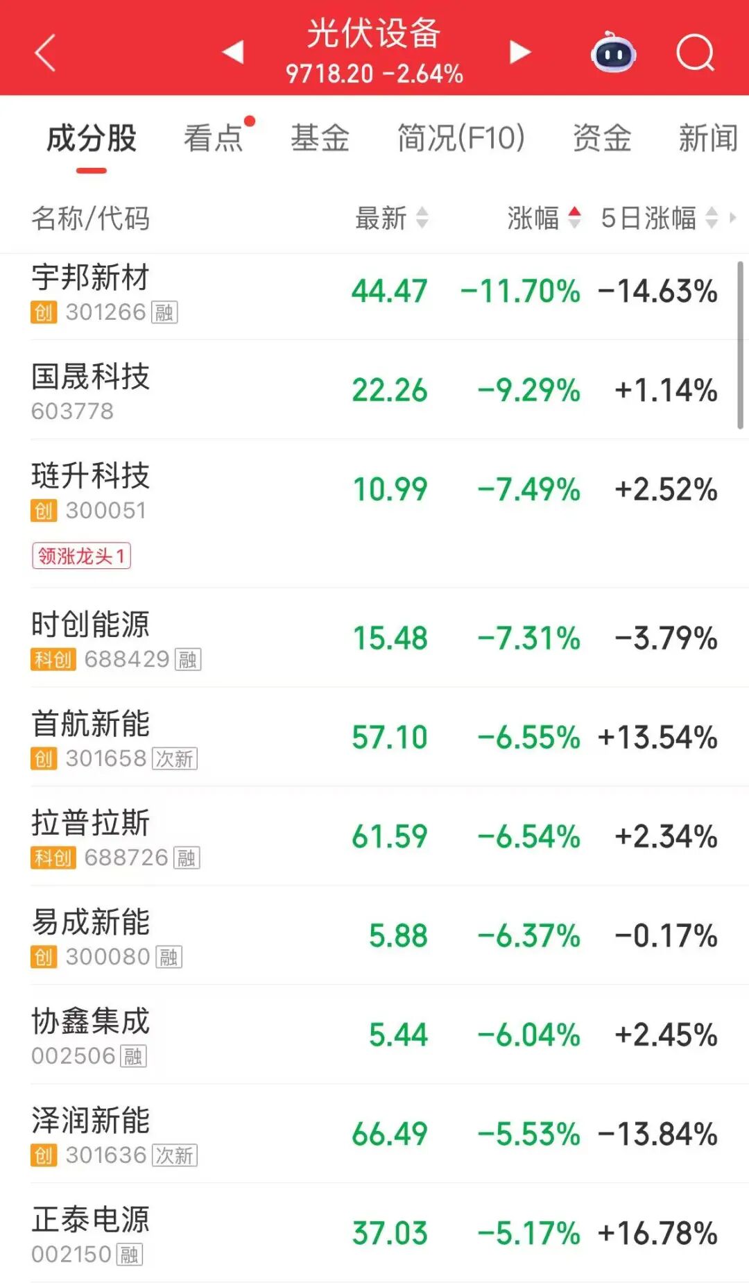 下跌方面,光伏板块调整,宇邦新材跌超10%。