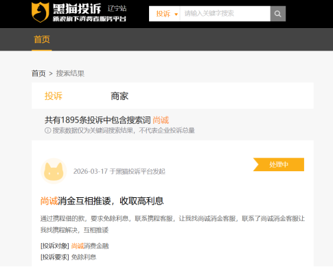 业绩增长的背后,尚诚消金的消费者投诉问题却持续凸显,与此次催收外包管理违规相呼应。据黑猫投诉【下载黑猫投诉客户端】平台数据,截至2026年3月25日,尚诚消金累计投诉量已达1895条,投诉核心集中在催收环节与信息安全层面,包括催收人员使用私人手机号向消费者单位及家人催收、频繁骚扰、言语恐吓,以及泄露消费者个人信息等行为,反映出公司在催收外包管理、客户信息保护等方面的内控管理存在显著短板。