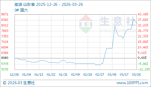 据生意社监测,柴油03月26日最新价格8145.00元/吨,最近5天上涨4.55%,10天上涨12.35%,20天上涨22.55%,30天上涨44.13%。
