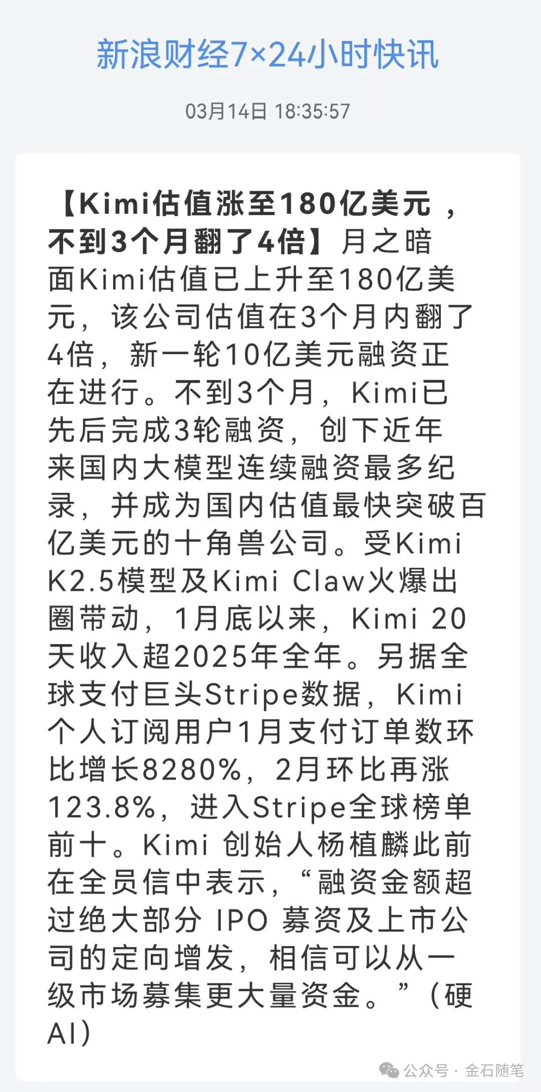 根据报道,Kimi不到3个月融资3轮,创下近年来国内大模型连续融资最多纪录。市场分析认为,主要是受kimi k2.5大模型及kimi积极拥抱养虾,推出Kimi Claw,此外该公司收入用户双双大增,共同推动了该公司估值。