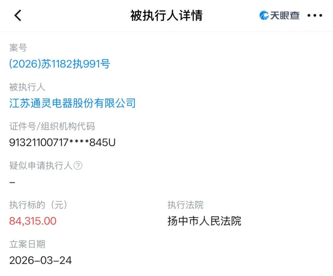 具体来看,3月24日,江苏通灵电器股份有限公司被列为被执行人,执行标的84,315.00元,案号为(2026)苏1182执991号,执行法院为扬中市人民法院。