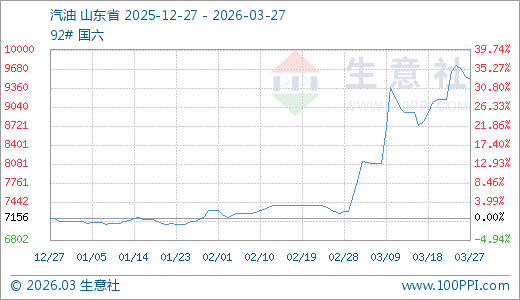 据生意社监测,汽油03月27日最新价格9509.14元/吨,最近5天上涨3.81%,10天上涨8.10%,20天上涨17.44%,30天上涨30.01%,60天上涨33.69%。