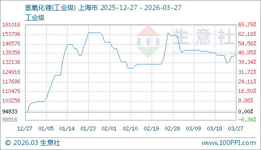 据生意社监测,氢氧化锂03月27日最新价格139000.00元/吨,最近90天上涨46.57%。