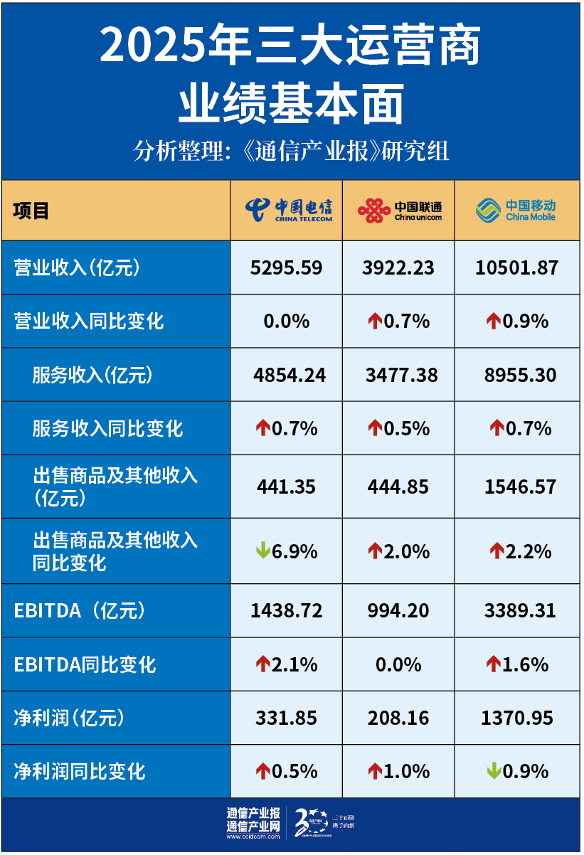 从业绩基本面来看,三大运营商的经营在2025年面临了较大的下行压力,但是业绩上升的动力依然可见,呈现出了“稳中有进、进中提质”的鲜明特征。