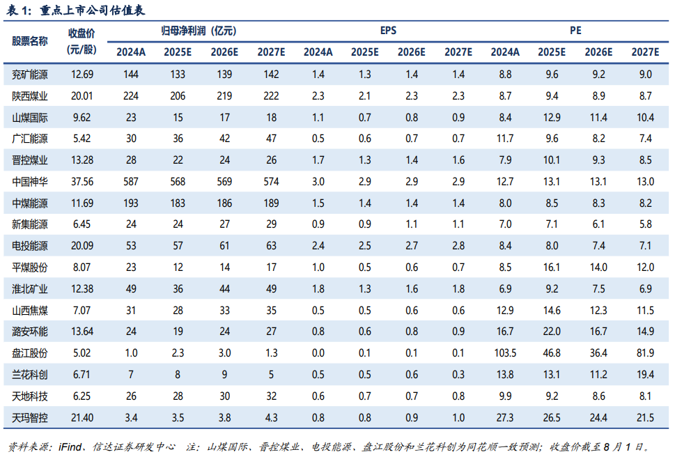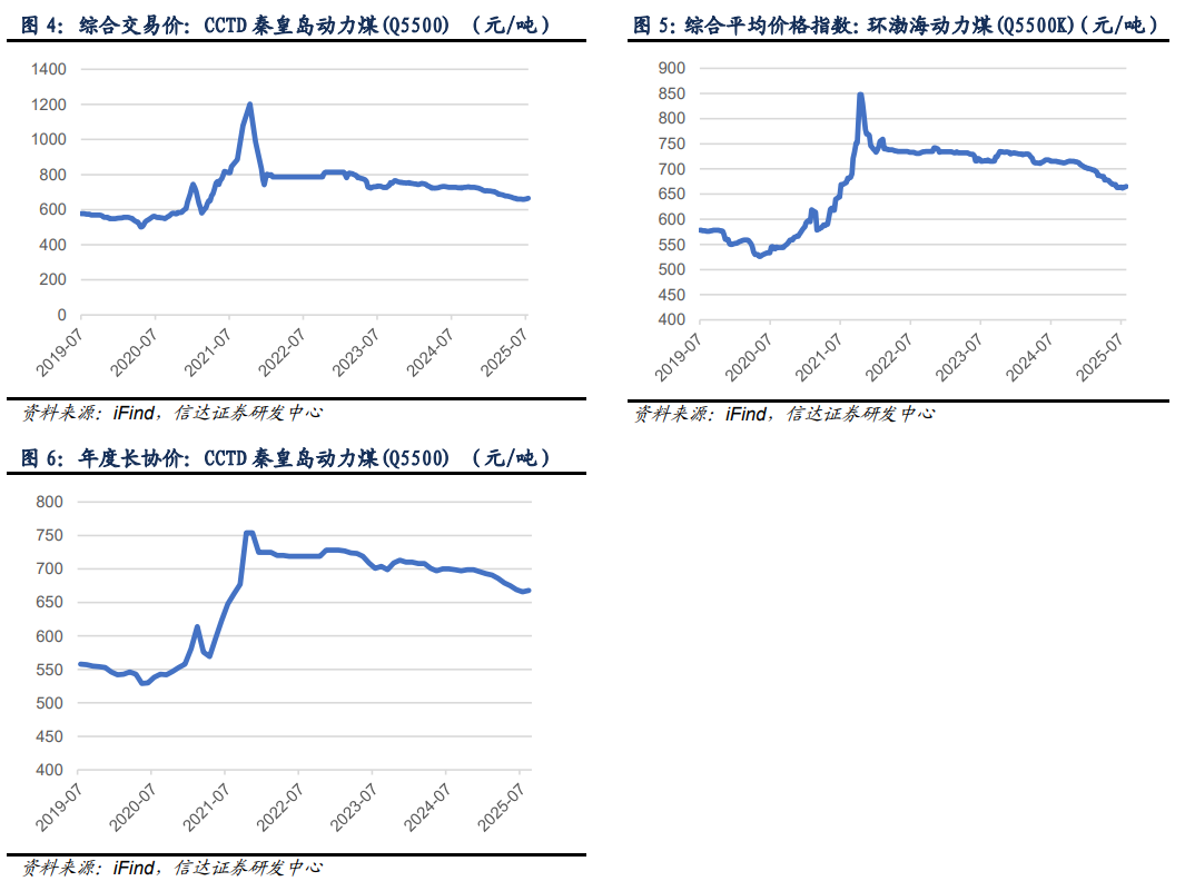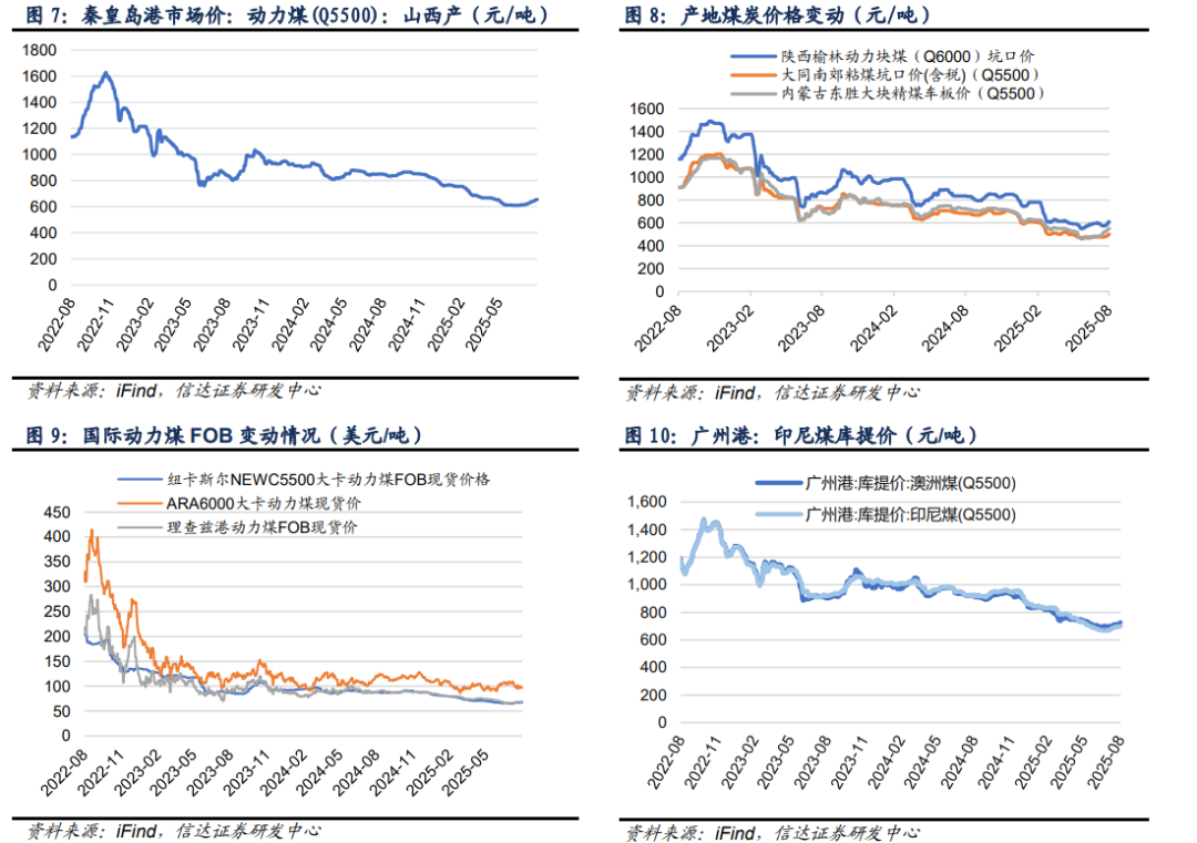 我们认为,当前正处在煤炭经济新一轮周期上行的初期,基本面、政策面共振,现阶段逢低配置煤炭板块正当时。本周基本面变化:供给方面,本周样本动力煤矿井产能利用率为90.9%(-3.1个百分点),样本炼焦煤矿井产能利用率为86.31%(-0.59个百分点)。需求方面,内陆17省日耗周环比上升44.40万吨/日(+13.05%),沿海8省日耗周环比上升1.00万吨/日(+0.45%)。非电需求方面,化工耗煤周环比上升5.73万吨/日(+0.84%);钢铁高炉开工率为83.46%(持平);水泥熟料产能利用率为58.09%(-0.01个百分点)。价格方面,本周秦港Q5500煤价收报655元/吨(+10元/吨);京唐港主焦煤价格收报1650元/吨(持平)。值得注意的是,7月31日国家能源局组织晋、陕、蒙、新等重点产煤省(区)开展煤矿生产情况核查,督促企业严格按公告能力组织生产,严禁超能力生产,维护好平稳有序的生产秩序。我们认为,受益于“查超产”政策,煤炭供给端有望逐步收缩,而需求方面在高温天气驱动下日耗或继续抬升,本轮煤炭板块回调主要是“反内卷”政策后情绪回落,煤炭板块基本面向好趋势不改,建议关注板块回调后的配置机遇。煤炭配置核心观点:当下,我们信达能源团队一直提出的煤炭产能短缺的底层投资逻辑未变(短期供需基本平衡,中长期仍存缺口)、煤价底部确立并中枢站上新平台的趋势未变、优质煤企高盈利&高现金流&高ROE&高分红的核心资产属性未变(ROE为10-15%,股息率>5%,新增中期分红)、以及煤炭资产相对低估且估值整体性仍有望提升的判断未变(一级矿权市场高溢价,多数公司PB约1倍),且公募基金煤炭持仓处于低配状态。基于此,煤炭板块配置策略不可忽视红利特性,又要把握顺周期弹性。即,煤炭板块向下回调有高股息边际支撑,向上弹性有后续煤价上涨预期催化,叠加伴随煤价底部确认有望带来估值重塑且具有较大提升空间,煤炭资产仍是具有性价比、高胜率和高赔率资产。当前,煤炭板块迎来较大回调,再次出现较高性价比的底部机会,反观煤炭企业不断实施增持、回购彰显发展信心。我们继续坚定看多煤炭,再度提示逢低配置。总体上,能源大通胀背景下,我们认为未来3-5年煤炭供需偏紧的格局仍未改变,优质煤炭企业依然具有高壁垒、高现金、高分红、高股息的属性,叠加煤价筑底推动板块估值重塑,板块投资攻守兼备且具有高性价比,短期板块回调后已凸显出较高的投资价值,再度建议重点关注现阶段煤炭的配置机遇。