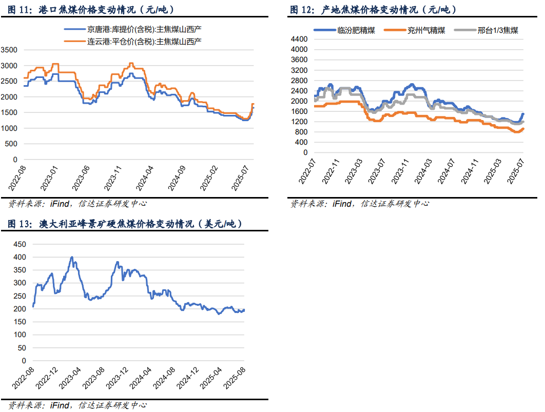 炼焦煤价格方面:本周京唐港价格周环比持平,产地临汾价格周环比增加。港口炼焦煤:截至8月1日,京唐港山西产主焦煤库提价(含税)1650元/吨,周持平;连云港山西产主焦煤平仓价(含税)1776元/吨,周持平。产地炼焦煤:截至8月1日,临汾肥精煤车板价(含税)1500.0元/吨,周环比上涨100.0元/吨;兖州气精煤车板价930.0元/吨,周环比上涨30.0元/吨;邢台1/3焦精煤车板价1200.0元/吨,周环比持平。国际炼焦煤:截至8月1日,澳大利亚峰景煤矿硬焦煤中国到岸价197.5美元/吨,周环比上涨3.7美元/吨。