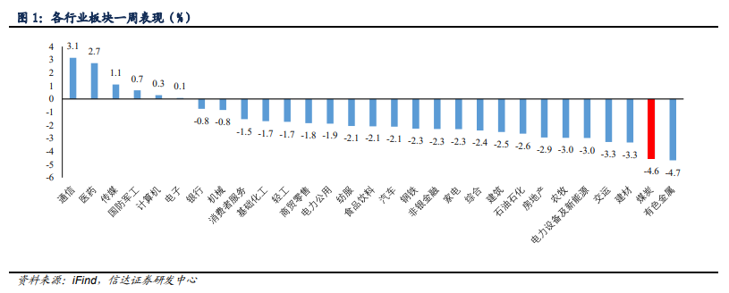 ⚫ 本周煤炭板块下跌4.56%,表现劣于大盘;本周沪深300下跌1.75%到4054.93;涨跌幅前三的行业分别是通信(3.14%)、医药(2.73%)、传媒(1.11%)。