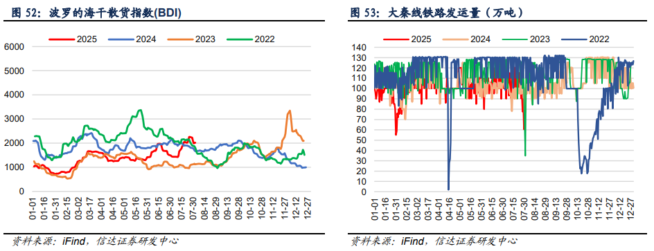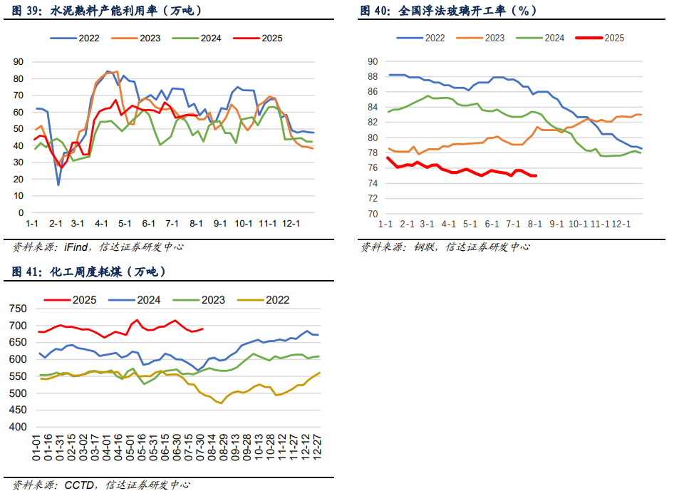 化工耗煤周环比增加,钢铁高炉开工率周环比持平。化工周度耗煤:截至8月1日,化工周度耗煤较上周上升5.73万吨/日,周环比增加0.84%。高炉开工率:截至8月1日,全国高炉开工率83.5%,周环比持平。水泥开工率:截至8月1日,水泥熟料产能利用率为58.1%,周环比下跌0.0百分点。