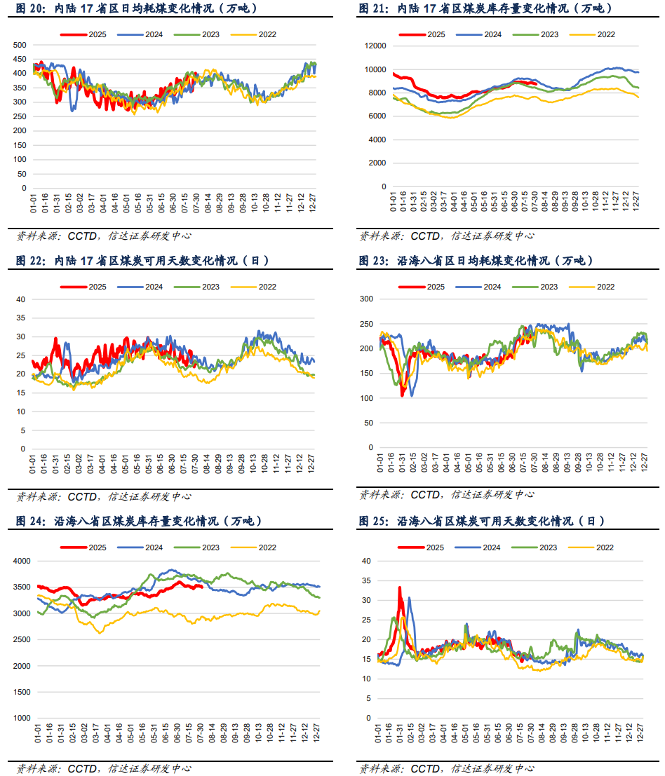 ⚫ 沿海8省:截至7月31日,沿海八省煤炭库存较上周下降38.20万吨,周环比下降1.08%;日耗较上周上升1.00万吨/日,周环比增加0.45%;可用天数较上周下降0.20天。