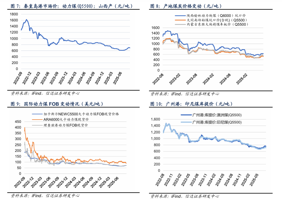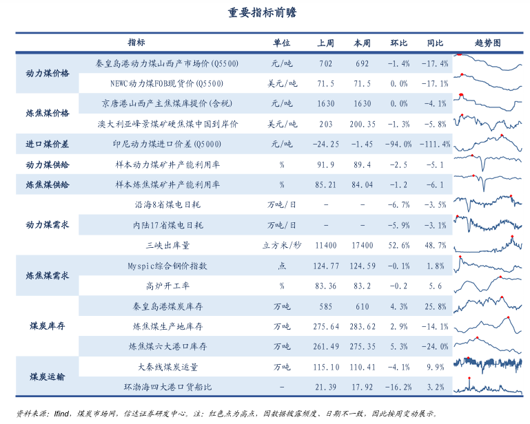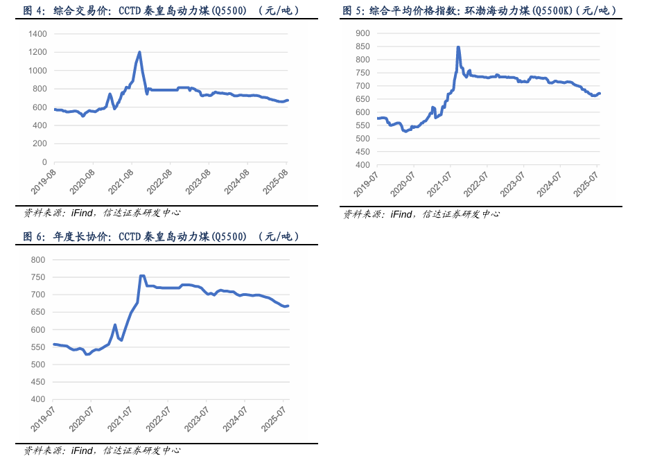 我们认为,当前正处在煤炭经济新一轮周期上行的初期,基本面、政策面共振,现阶段逢低配置煤炭板块正当时。本周基本面变化:供给方面,本周样本动力煤矿井产能利用率为89.4%(-2.5个百分点),样本炼焦煤矿井产能利用率为84.04%(-1.17个百分点)。需求方面,内陆17省日耗周环比下降22.90万吨/日(-5.89%),沿海8省日耗周环比下降17.10万吨/日(-6.73%)。非电需求方面,化工耗煤周环比上升0.95万吨/日(+0.14%);钢铁高炉开工率为83.2%(-0.16个百分点);水泥熟料产能利用率为36.27%(-8.21个百分点)。价格方面,本周秦港Q5500煤价收报692元/吨(-10元/吨);京唐港主焦煤价格收报1630元/吨(持平)。值得注意的是,本周煤炭产地受降雨影响供应收缩,随着用电高峰渐退,下游日耗也有所回落,煤炭价格小幅走弱。按照季节性规律,9月日耗或逐步回落,需求端短期仍承压运行,后续供给端变化值得重点关注。近两个月来,旺季需求叠加供给收缩推动产业链煤炭库存去化,当前库存水平基本回落至去年同期区间,若后续供给恢复不及预期,或将对煤价形成较强支撑,需持续关注供给边际变化情况。煤炭配置核心观点:当下,我们信达能源团队一直提出的煤炭产能短缺的底层投资逻辑未变(短期供需基本平衡,中长期仍存缺口)、煤价底部确立并中枢站上新平台的趋势未变、优质煤企高盈利&高现金流&高ROE&高分红的核心资产属性未变(ROE为10-15%,股息率>5%,新增中期分红)、以及煤炭资产相对低估且估值整体性仍有望提升的判断未变(一级矿权市场高溢价,多数公司PB约1倍),且公募基金煤炭持仓处于低配状态。基于此,煤炭板块配置策略不可忽视红利特性,又要把握顺周期弹性。即,煤炭板块向下回调有高股息边际支撑,向上弹性有后续煤价上涨预期催化,叠加伴随煤价底部确认有望带来估值重塑且具有较大提升空间,煤炭资产仍是具有性价比、高胜率和高赔率资产。当前,煤炭板块迎来较大回调,再次出现较高性价比的底部机会,反观煤炭企业不断实施增持、回购彰显发展信心。我们继续坚定看多煤炭,再度提示逢低配置。总体上,能源大通胀背景下,我们认为未来3-5年煤炭供需偏紧的格局仍未改变,优质煤炭企业依然具有高壁垒、高现金、高分红、高股息的属性,叠加煤价筑底推动板块估值重塑,板块投资攻守兼备且具有高性价比,短期板块回调后已凸显出较高的投资价值,再度建议重点关注现阶段煤炭的配置机遇。