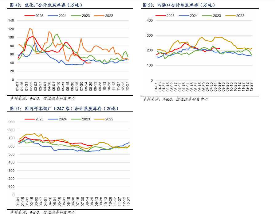 ⚫ 港口库存:截至8月29日,四港口合计焦炭库存较上周下降2.5万吨至212.1万吨,周环比下降1.18%。