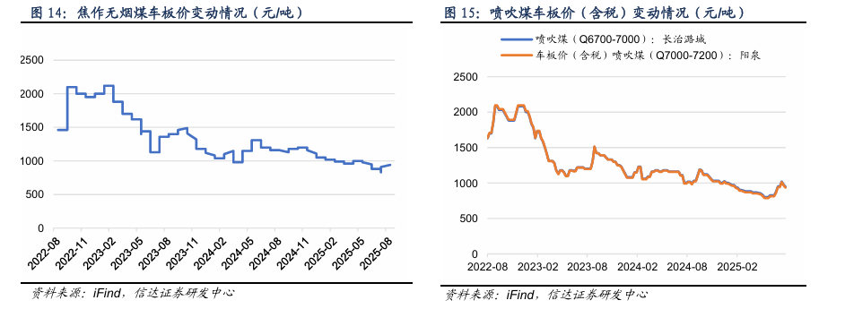 ⚫ 截至8月22日,长治潞城喷吹煤(Q6700-7000)车板价(含税)价格947.0元/吨,周环比下跌30.0元/吨;阳泉喷吹煤车板价(含税)(Q7000-7200)936.0元/吨,周环比下跌30.7元/吨。
