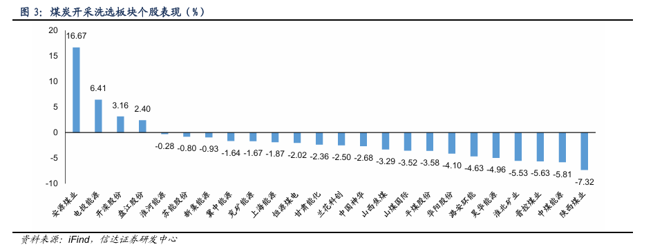⚫ 本周煤炭采选板块中涨跌幅前三的分别为安源煤业(16.67%)、电投能源(6.41%)、开滦股份(3.16%)。