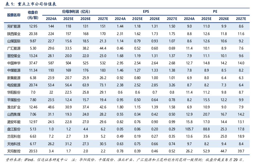结合我们对能源产能周期的研判,煤炭供给瓶颈约束有望持续至“十五五”,仍需新规划建设一批优质产能以保障我国中长期能源煤炭需求。在煤炭布局加速西移、资源费与吨煤投资大幅提升背景下,国内经济开发刚性成本和国外进口煤成本的抬升均有望支撑煤价中枢保持高位。当前,煤炭板块仍属高业绩、高现金、高分红资产,行业仍具高景气、长周期、高壁垒特征,叠加宏观经济底部向好,央企市值管理新规落地,煤炭央国企资产注入工作已然开启,以及一二级市场估值倒挂,愈加凸显优质煤炭公司盈利与成长的高确定性。煤炭板块向下调整有高股息安全边际支撑,向上弹性有后续煤价上涨预期催化,我们继续全面看多“或跃在渊”的煤炭板块。自上而下重点关注:一是经营稳定、业绩稳健的中国神华、陕西煤业、中煤能源、新集能源;二是前期超跌、弹性较大的兖矿能源、电投能源、广汇能源、晋控煤业、山煤国际、甘肃能化等;三是全球资源特殊稀缺的优质冶金煤公司淮北矿业、平煤股份、潞安环能、山西焦煤、盘江股份等;同时建议关注华阳股份、兖煤澳大利亚、天地科技、兰花科创、上海能源、天玛智控等。