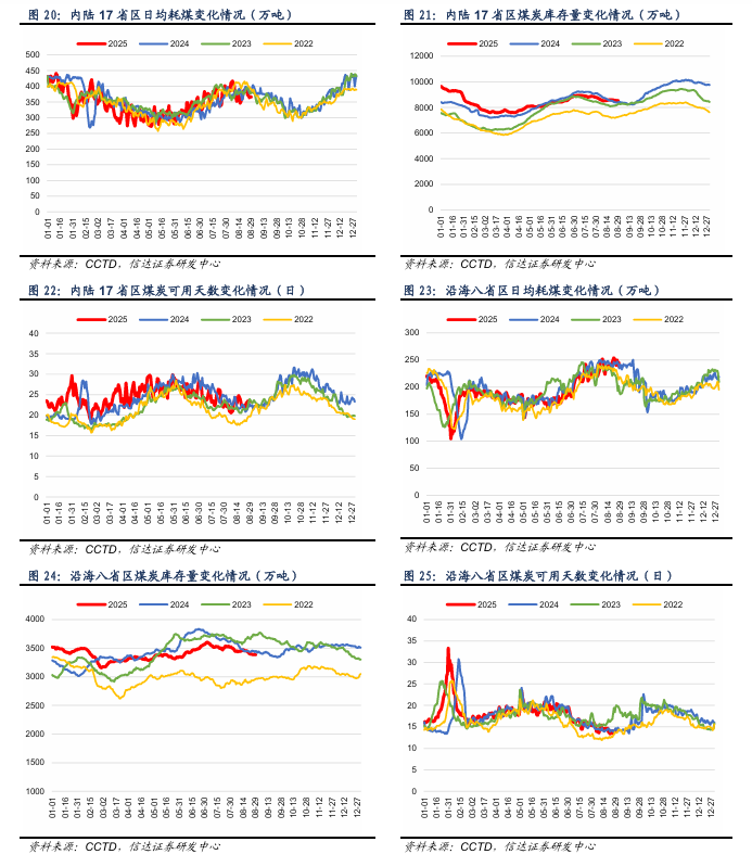 ⚫ 内陆17省:截至8月28日,内陆十七省煤炭库存较上周下降50.60万吨,周环比下降0.59%;日耗较上周下降22.90万吨/日,周环比下降5.89%;可用天数较上周上升1.20天。