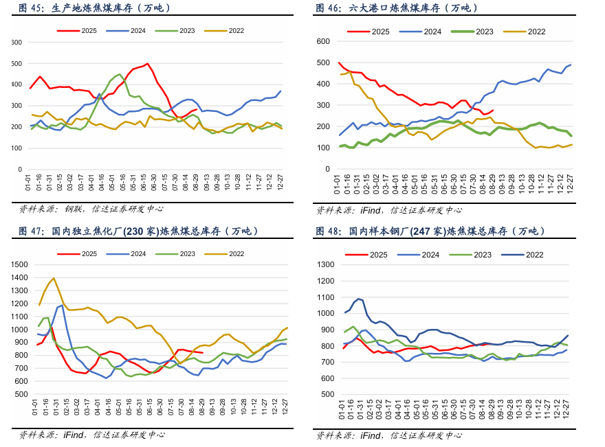 ⚫ 港口库存:截至8月29日,六大港口炼焦煤库存较上周增加13.9万吨至275.4万吨,周环比增加5.30%。