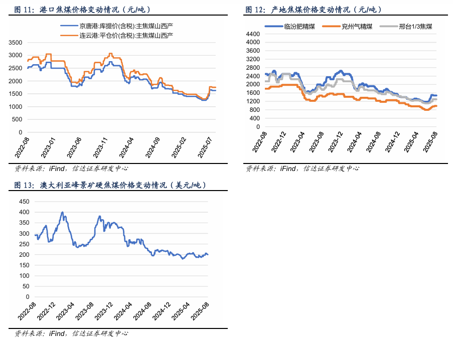 ⚫ 产地炼焦煤:截至8月29日,临汾肥精煤车板价(含税)1480.0元/吨,周环比持平;兖州气精煤车板价985.0元/吨,周环比持平;邢台1/3焦精煤车板价1300.0元/吨,周环比持平。
