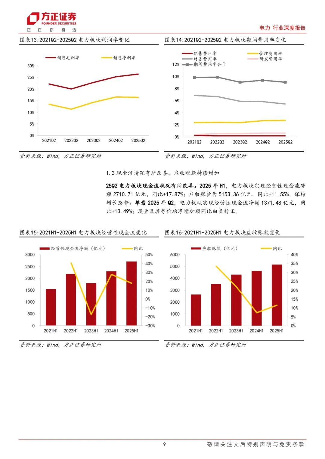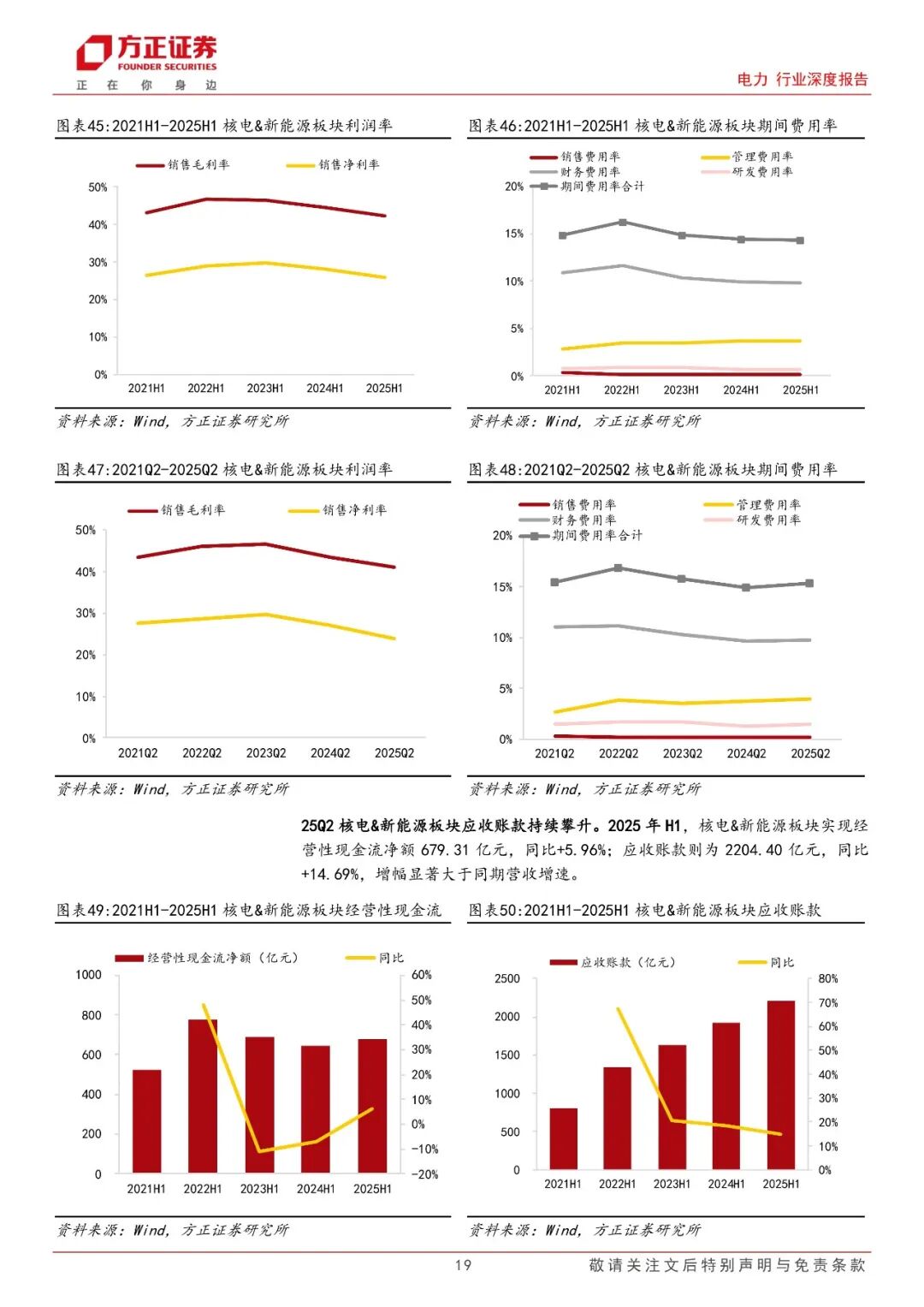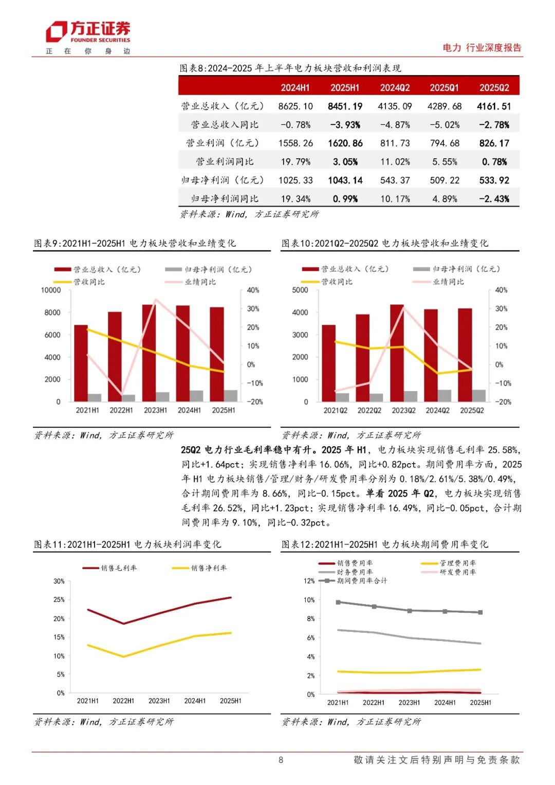 电力2025年中报综述:Q2营收业绩同比承压,毛利率稳中有升。2025年上半年全社会用电量同比+3.7%,其中一、二季度同比分别增长2.5%和4.9%;分电源来看,2025年Q2我国火电发电量增速实现了环比转正,而水电、核电和新能源的发电量增速则有所缩窄。在此基础上,2025Q2电力板块营业总收入同比略降,降幅较2025Q1环比缩窄,我们推测系在电价普遍下降时电量季度改善缓解了营收端压力,但在营业成本下降的基础上,电力板块毛利率企稳并有所回升。