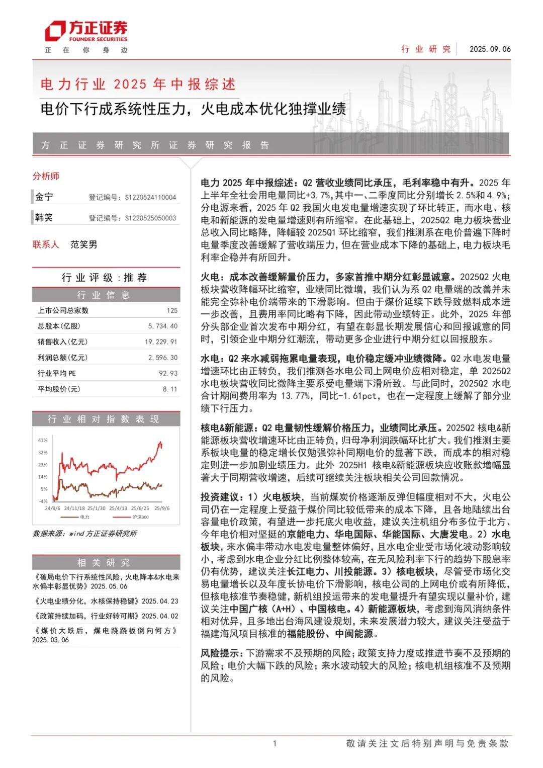 本文来自方正证券研究所于2025年9月7日发布的报告《电价下行成系统性压力,火电成本优化独撑业绩》,欲了解具体内容,请阅读报告原文。