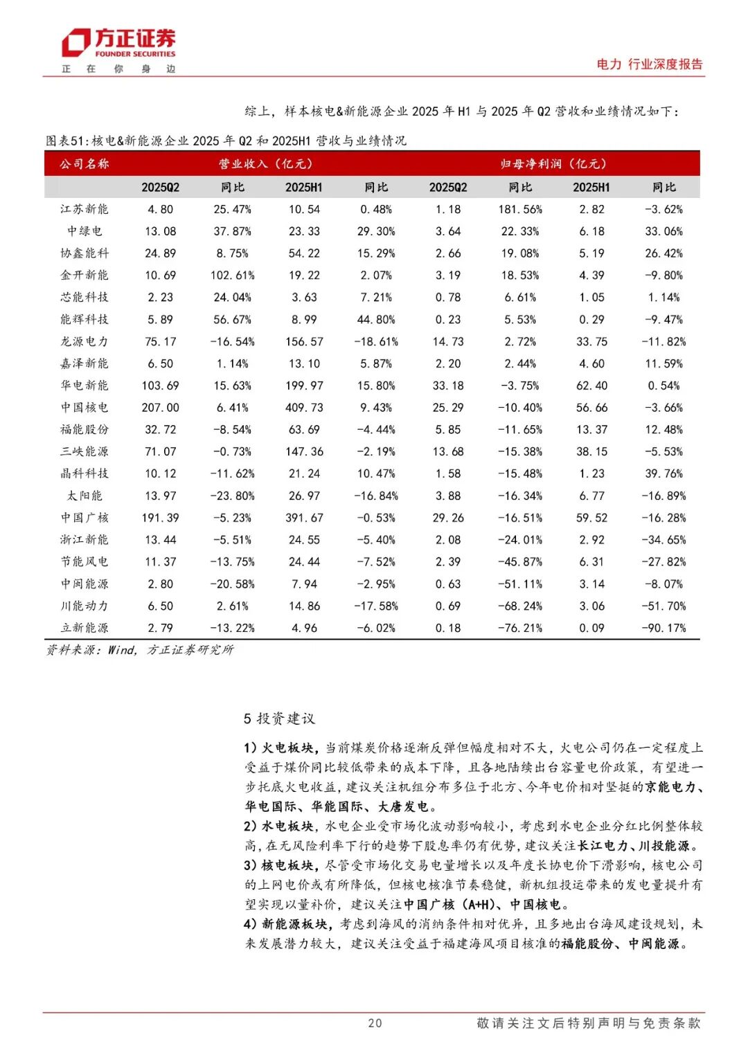投资建议:1)火电板块,当前煤炭价格逐渐反弹但幅度相对不大,火电公司仍在一定程度上受益于煤价同比较低带来的成本下降,且各地陆续出台容量电价政策,有望进一步托底火电收益,建议关注机组分布多位于北方、今年电价相对坚挺的京能电力、华电国际、华能国际、大唐发电。2)水电板块,来水偏丰带动水电发电量整体偏好,且水电企业受市场化波动影响较小,考虑到水电企业分红比例整体较高,在无风险利率下行的趋势下股息率仍有优势,建议关注长江电力、川投能源。3)核电板块,尽管受市场化交易电量增长以及年度长协电价下滑影响,核电公司的上网电价或有所降低,但核电核准节奏稳健,新机组投运带来的发电量提升有望实现以量补价,建议关注中国广核(A+H)、中国核电。4)新能源板块,考虑到海风消纳条件相对优异,且多地出台海风建设规划,未来发展潜力较大,建议关注受益于福建海风项目核准的福能股份、中闽能源。