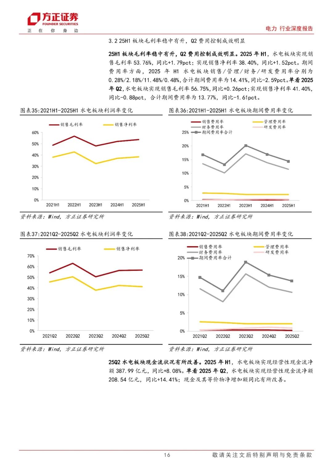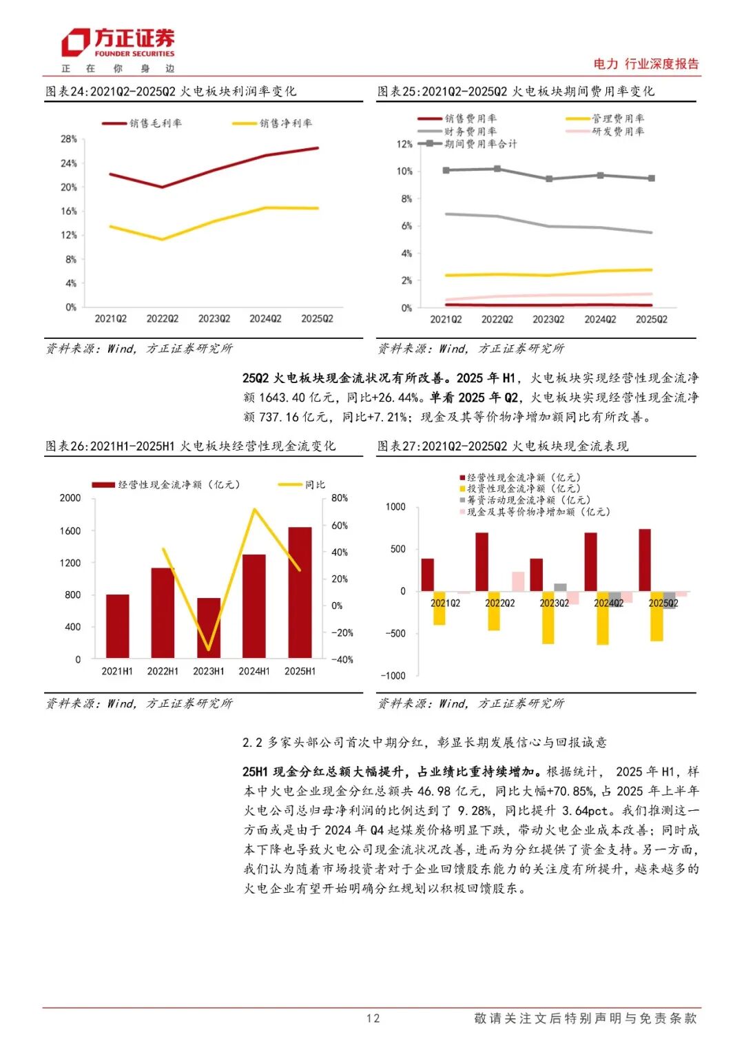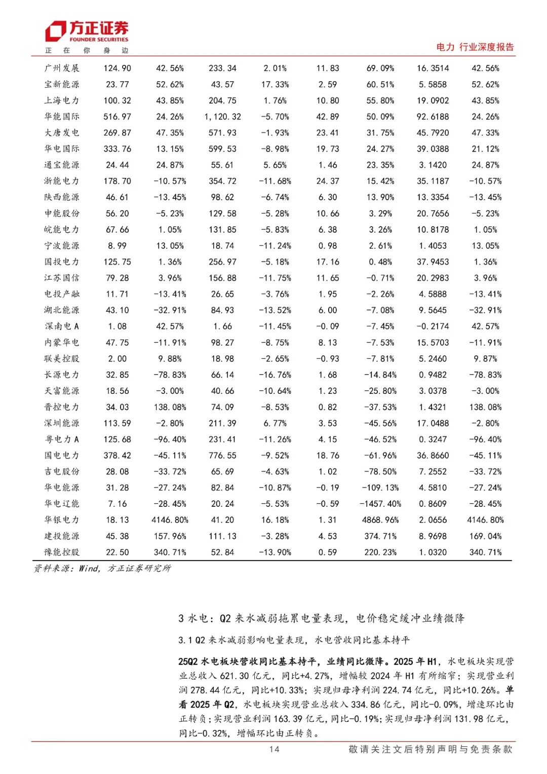 火电:成本改善缓解量价压力,头部企业首推中期分红彰显诚意。2025Q2火电板块营收降幅环比缩窄,业绩同比微增,我们认为系Q2电量端的改善并未能完全弥补电价端带来的下滑影响。但由于煤价延续下跌导致燃料成本进一步改善,且费用率同比略有下降,因此带动业绩转正。此外,2025年部分头部企业首次发布中期分红,有望带动更多企业进行中期分红以回报股东。