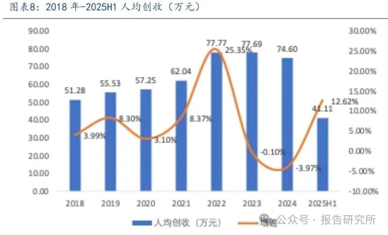 2025H1 人均单产提升,固定资产周转率小幅增长。2025 年上半年人效同比提升,其中人均创 收为 41.11 万元,同比增长 12.62%,人均创利为 11.40 万元,同比增长 52.41%,主要原因是行业 复苏以及运营效率提升,收入、利润端的增速快于员工总数的增速;2025 年上半年,固定资产周 转率为 1.00 次,同比增长 7.03%,主要原因是行业逐步复苏以及运营效率提升,短期内收入增速 快于于固定资产增速。
