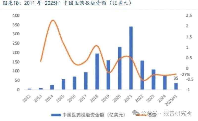 国外国内投融资下滑,未来有望接续复苏。根据动脉网发布的全球及中国医疗健康产业投融 资数据,2025 年上半年全球及中国医药融资额分为 275、35 亿美元,同比下降 10%、35%,融资事 件数分别为 973、357 件,同比下降 19%、14%。我们认为,全球医疗健康产业一级市场的投融资活 跃度在经历调整后目前已处于逐步恢复的过程,2025H1 全球及国内投融资金额及事件数同比下滑, 未来随着美联储降息进程的推进,港股及 A 股创新药持续活跃,海外及国内的投融资或将接续回 暖。