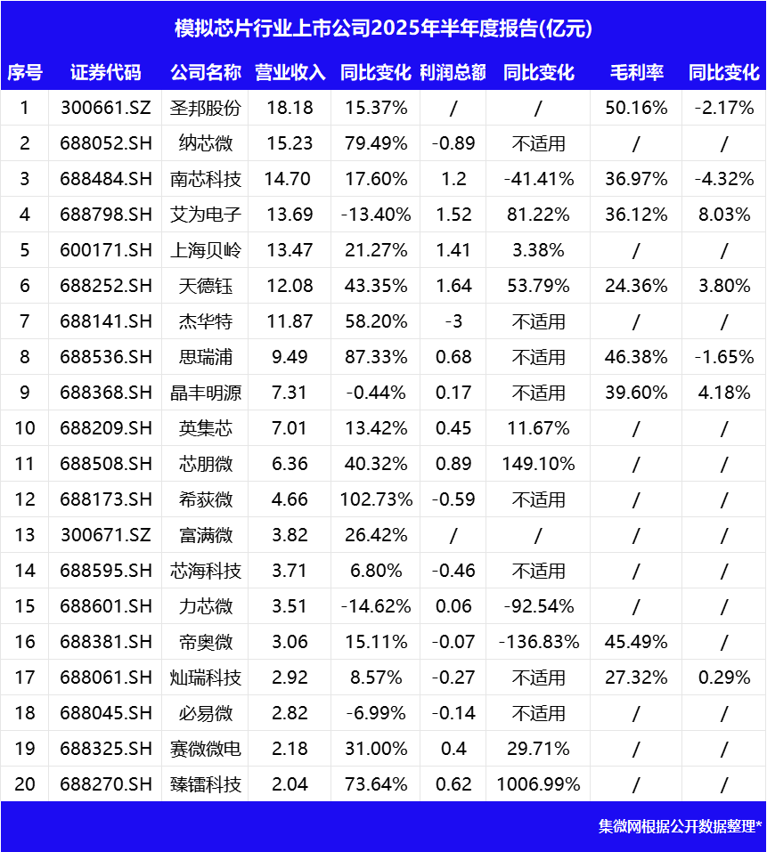 此前,集微网观察模拟芯片厂商2025年半年报发现,希荻微以102.73%的营收同比增速领跑,思瑞浦、纳芯微分别以87.33%、79.49%的增速紧随其后;从毛利率看,圣邦股份、思瑞浦、帝奥微等毛利率均超45%。