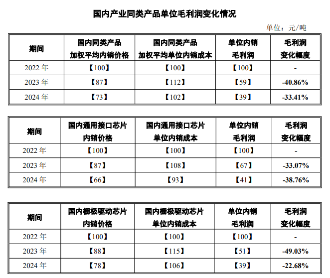 上述现象导致我国国内同类产品毛利率大幅下降。2023 年相比2022年,国内产业同类产品的加权平均单位内销毛利润下降了40.86%,其中通用接口芯片的单位内销毛利润下降了 33.07%,栅极驱动芯片的单位内销毛利润下降了49.03%。