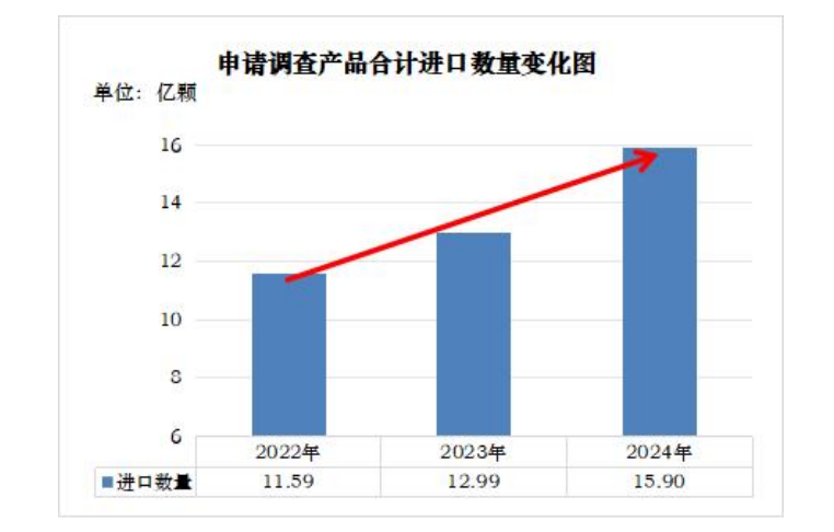 数据显示,2022年至2024年,申请调查产品平均价格分别为3.36元/颗、2.21元/颗和1.62元/颗,而2023年、2024年与上年相比分别下降34.32%和26.57%,2024年相比2022年累计大幅下降51.77%!