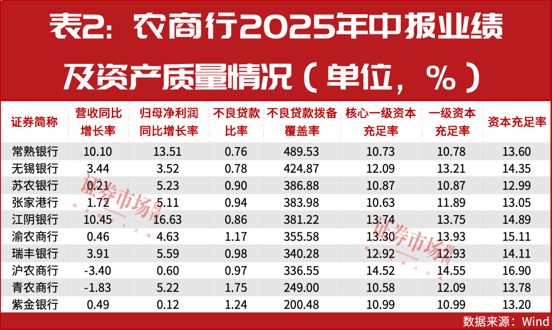 常熟银行的业绩在农商行中十分显眼,上半年该行共实现营业收入60.62亿元,同比增10.10%;实现归母净利润19.69亿元,同比增13.51%,在农商行中属于第二高。