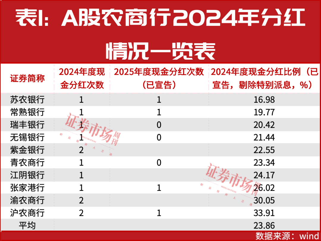 2024年以来,在政策鼓励下,越来越多的A股上市银行派发中期分红,不过相对来说,农村商业银行的分红比例较低。