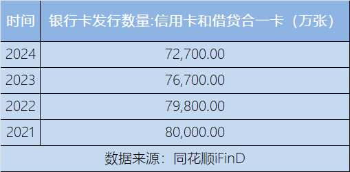 央行数据显示,自2021年至2024年,我国信用卡(含借贷合一卡)发行量连续四年下滑,累计减少7300万张。2021年发行量为80000万张,2022年降至79800万张,2023年进一步降至76700万张,2024年为72700万张。