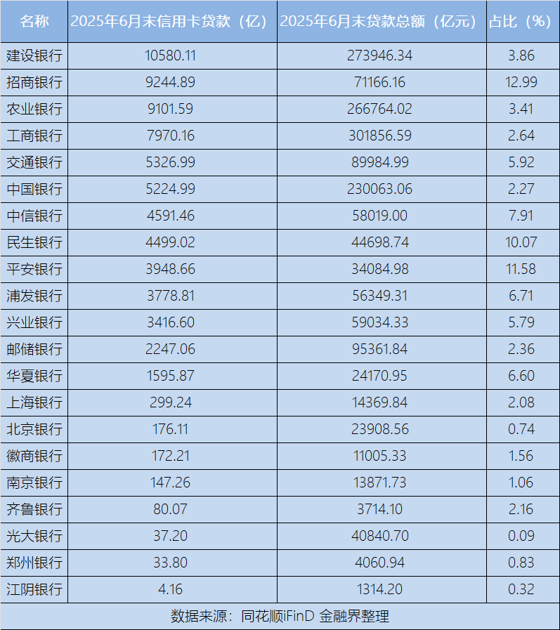国有大行凭借庞大的客户基础与信贷规模,信用卡贷款同样不容小觑。例如,建设银行为10580.11亿元,占比3.86%;农业银行为9101.59亿元,占比3.41%;工商银行2025年6月末信用卡贷款为7970.16亿元,占总贷款的2.64%。