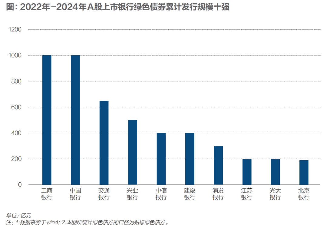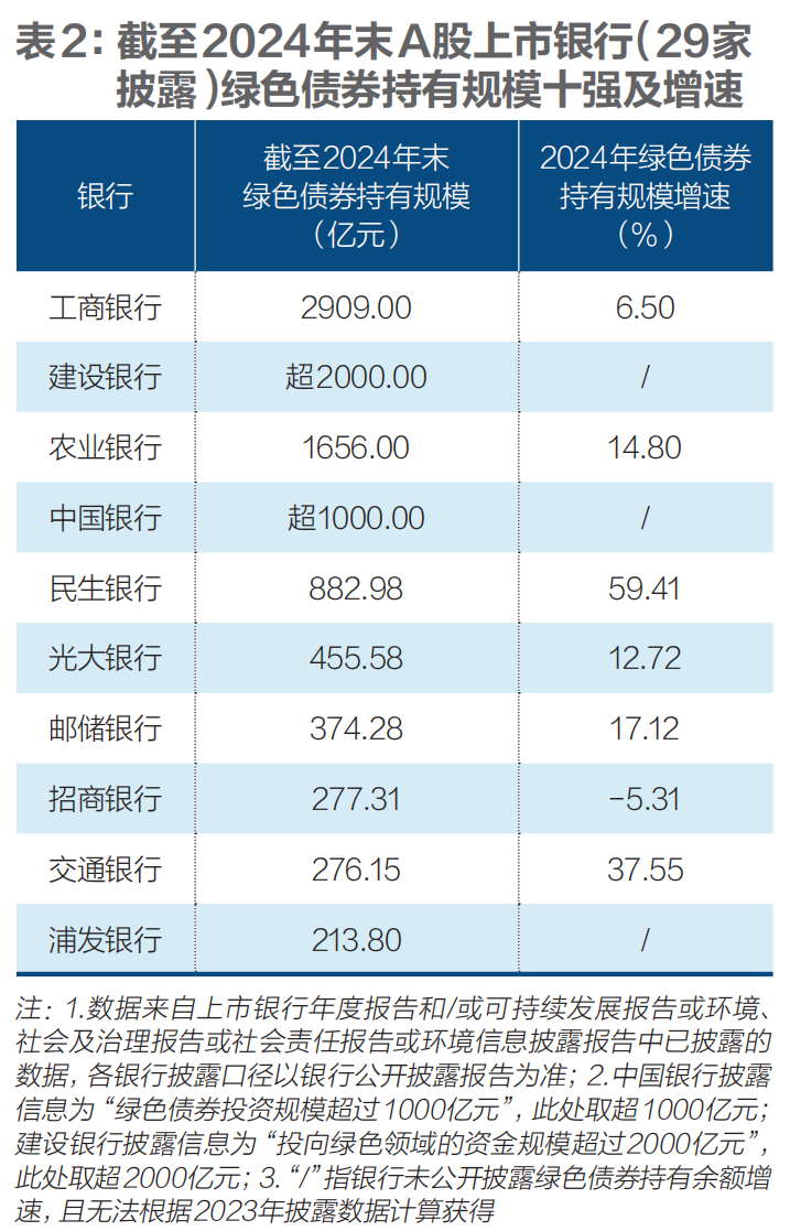 此外,全国性股份制银行中,民生银行绿债投资余额最大,达882.98亿元;城商行中,北京银行余额最大,达207.86亿元;农商行中,沪农商行余额最大,为175.46亿元。