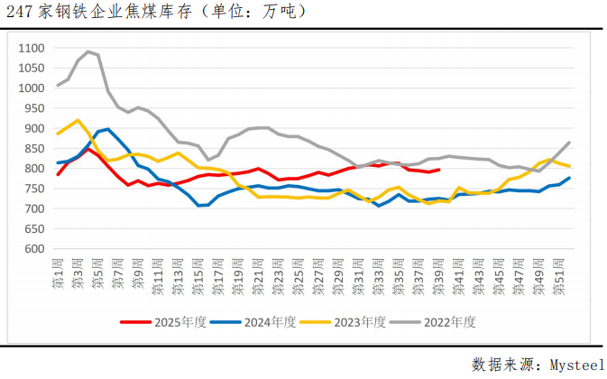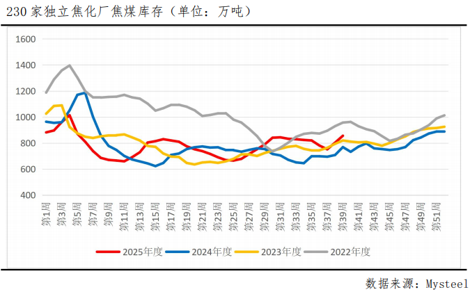 双节补库周期的结束,使焦煤需求支撑明显减弱。Myteel数据显示,截至9月26日,全国230家样本独立焦化厂炼焦煤总库存为856.23万吨,环比前一周增加53.06万吨,增幅6.61%,已连续两周增加。而钢厂焦煤库存也显著高于过去两年同期,进一步补库意愿不强。这意味着节前补库需求已基本饱和,后续采购动力不足。