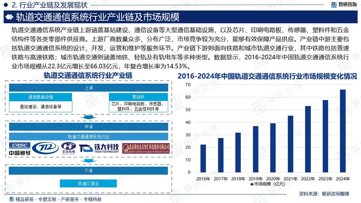 轨道交通通信系统是一种集音频、视频、数据等各种信息于一体的综合业务数字通信网络,它不仅是指挥列车运行的重要手段,也是传递各种信息的关键途径,对于保证列车安全、快速、高效运行至关重要。轨道交通通信系统主要由通信电源系统、传输系统、时钟系统、无线调度系统、电视监控系统、广播系统、乘客信息系统、公务电话系统与调度电话系统等组成。近年来,随着5G、云计算、大数据、物联网及信息安全等技术的迅猛发展,我国轨道交通网络日益完善、行车调度复杂性不断提高,对高可靠性、智能化和通信系统需求持续扩展。与此同时,随着我国经济社会的快速发展和科技实力的不断增强,国民生活水平富足程度的提高使得越来越多民众对轨道交通出行的安全性、便捷性和舒适性提出更高要求,我国轨道交通通信系统的建设力度和发展力度持续加大。数据显示,2016-2024年中国轨道交通通信系统行业市场规模从22.3亿元增长至66.03亿元,年复合增长率为14.53%。目前,轨道交通通信系统领域因存在较高的技术壁垒和特定的行业管理政策,形成了严格的准入制度和较高的行政许可门槛。从应用领域看,传统铁路通信系统行业内的企业数量较少,市场集中度较高,竞争格局相对温和;产品价格虽通过招投标确定,但因竞争稳定而整体保持平稳。与此同时,我国地铁、轻轨、有轨电车等城市轨道交通正处于高速发展期,吸引大量通信系统供应商进入,导致该细分领域竞争较为激烈,市场集中度相对较低。当前轨道交通通信系统行业主要参与者包括中国铁路通信信号股份有限公司、天津七一二通信广播股份有限公司、北京锦鸿希电信息技术股份有限公司、上海铁大电信科技股份有限公司、北京世纪东方智汇科技股份有限公司、上海铁路通信有限公司、众合智行轨道交通技术有限公司等企业。其中,中国通号与七一二作为老牌上市企业,凭借较强的自主创新能力和广泛的市场覆盖,在行业中占据领先地位和较大市场份额。