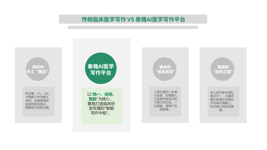 今天,泰格医药集团正依托旗下子公司泰雅科技的技术实力,致力于为您彻底终结这一低效困局。泰雅AI医学写作平台以“统一、协同、智能”为核心,聚焦打造临床研发专属的“智能写作中枢”——推动医学写作从传统的单点工具辅助,升级为全流程、全要素深度覆盖的“全域赋能”模式,真正实现“一次输入,多次复用;一处修改,全局同步” 的革命性工作方式,重塑临床研发文档生态。
