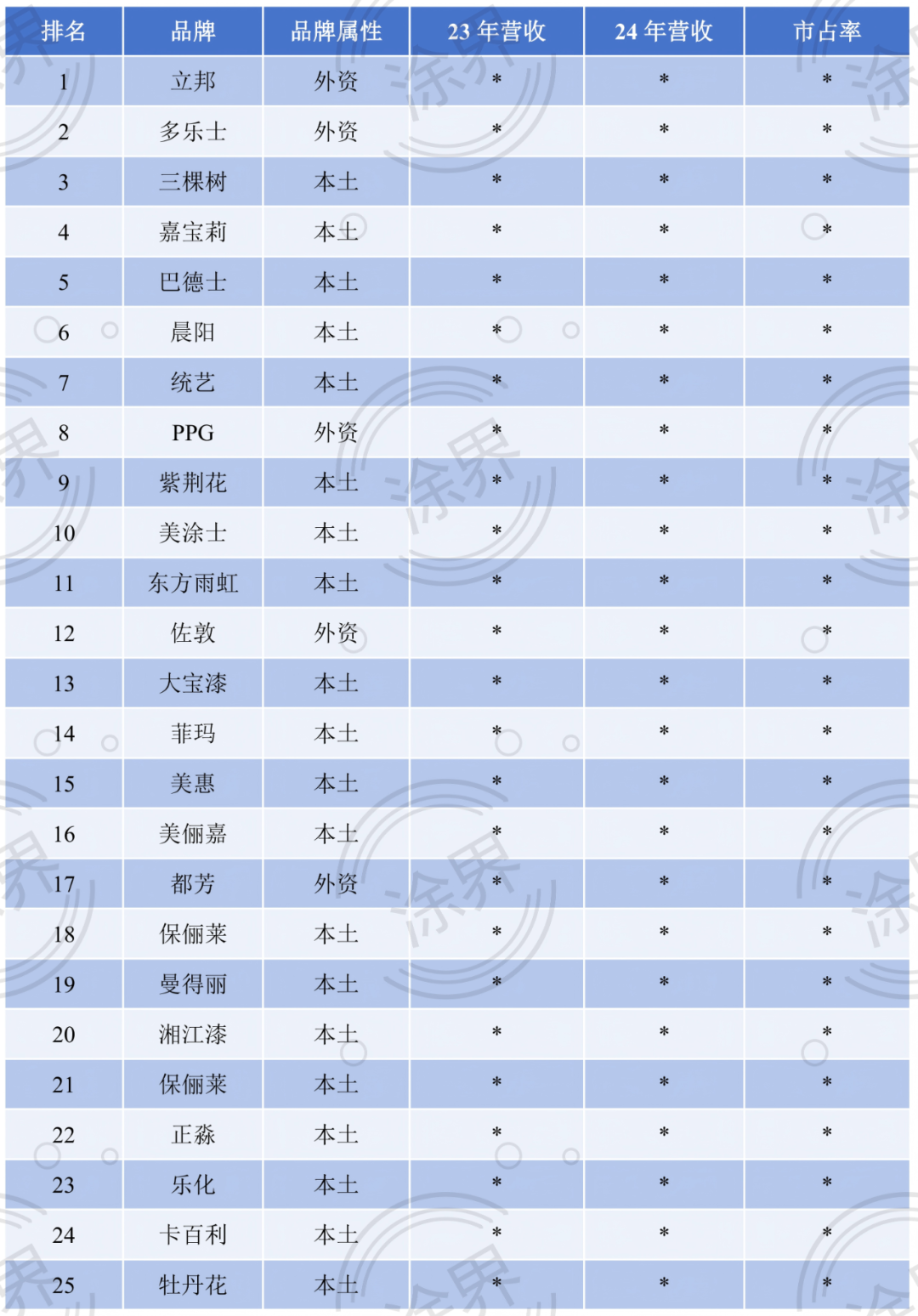 从整个榜单来看,外资品牌占据了5席,累计销售收入为196.6亿元,占榜单收入比例为69.08%;国产品牌占据了20席,累计销售收入为87.99亿元,占榜单收入比例为30.92%。除了立邦、多乐士外,PPG、佐敦、都芳等外资品牌都有一定的知名度,并占据一定的市场份额。