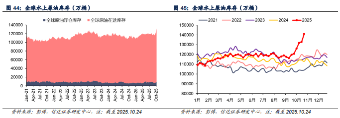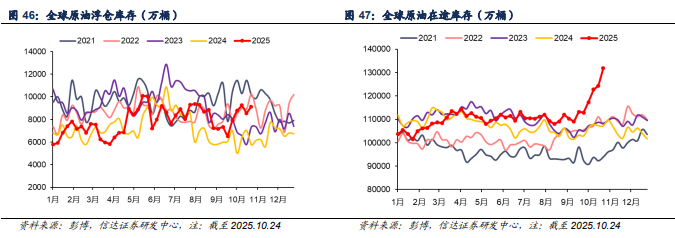 截至2025年10月24日当周,全球原油水上库存(包括在途和浮仓)为14.09亿桶,较上周+7978.1万桶(+5.66%)。其中,全球原油浮仓库存为9132.5万桶,较上周+578.1万桶(+6.33%);全球原油在途库存为13.18亿桶,较上周+7400万桶(+5.61%)。
