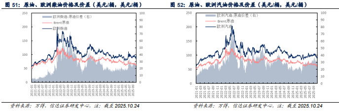 欧洲市场:截至2025年10月24日当周,欧洲柴油、汽油、航煤周均价分别为90.70(+1.96)、92.31(-2.28)、96.60(+2.20)美元/桶;与原油差价分别为28.01(+1.64)、29.62(-2.60)、33.91(+1.88)美元/桶。