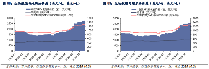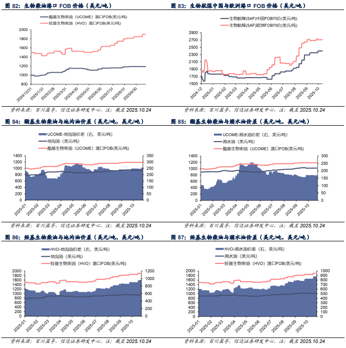 生物航煤价格及价差:截至2025年10月24日,中国生物航煤港口FOB价格为2400美元/吨,较上周五价格持平,与地沟油、潲水油价差分别为1466.94、1379.25美元/吨,较上周五价差分别+10.15、-0.30美元/吨。欧洲生物航煤港口FOB价格为2710美元/吨,较上周五价格持平。