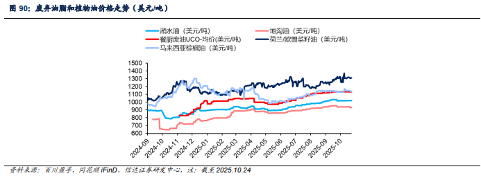 原料油价格:截至2025年10月24日,中国地沟油、潲水油价格分别为933.06、1020.75美元/吨,较上周五价格分别-10.15、+0.30美元/吨,中国餐厨废油UCO价格为1135美元/吨,较上周五价格持平。