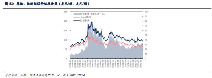 原油价格:截至2025年10月24日当周,布伦特原油期货结算价为65.20美元/桶,较上周上升3.91美元/桶(+6.38%);WTI原油期货结算价为61.50美元/桶,较上周上升4.35美元/桶(+7.61%);俄罗斯Urals原油现货价为65.49美元/桶,与上周持平;俄罗斯ESPO原油现货价为60.35美元/桶,较上周上升2.62美元/桶(+4.54%)。