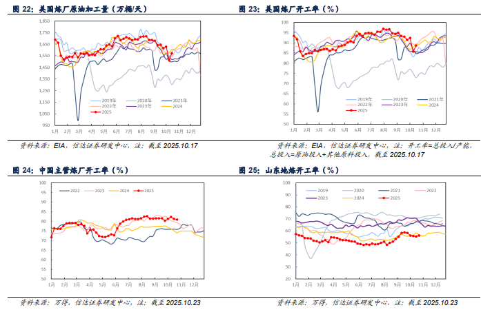 中国炼厂:截至2025年10月23日,主营炼厂开工率为80.89%,较上周下降0.34pct。截至2025年10月22日,山东地炼开工率为56.22%,较上周上升0.88pct。
