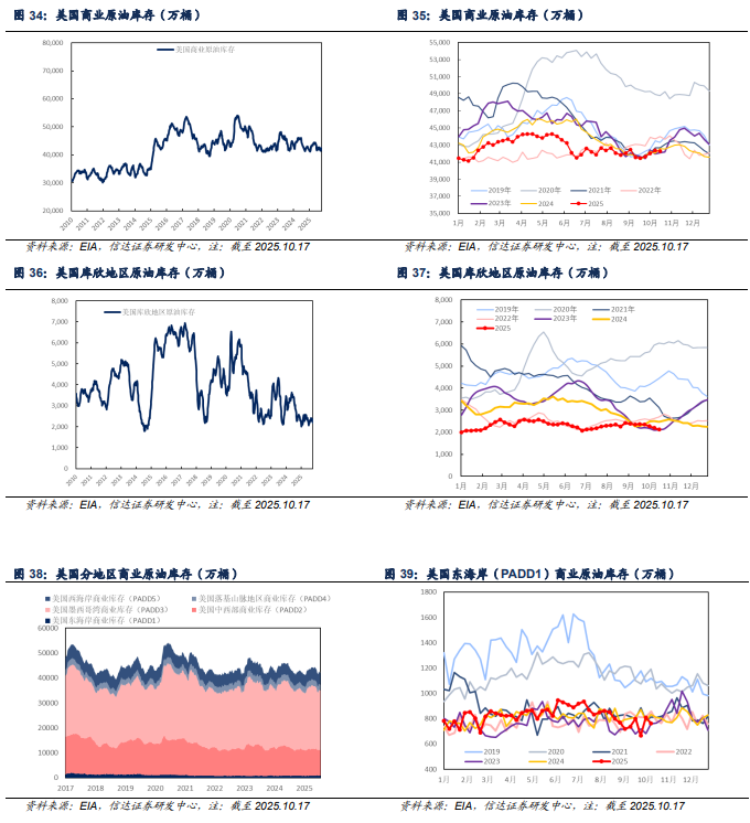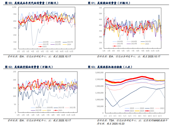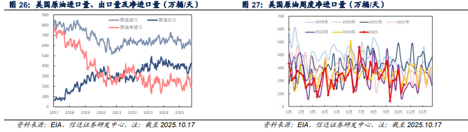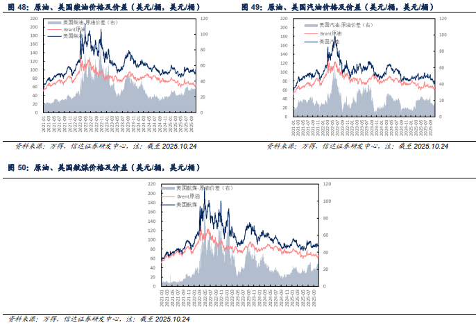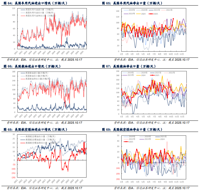 消费方面:截至2025年10月17日当周,美国成品车用汽油、柴油、航空煤油消费量分别为845.4、384.7、171.9万桶/天,较上周分别-0.1(-0.01%)、-38.6(-9.12%)、+2.8(+1.66%)万桶/天。