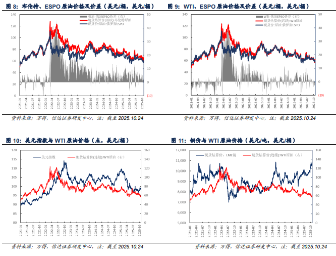 原油价差:截至2025年10月24日当周,布伦特-WTI期货价差为3.7美元/桶,较上周收窄0.44美元/桶;布伦特现货-期货价差为1.84美元/桶,较上周扩大2.05美元/桶;布伦特-俄罗斯Urals价差为-0.29美元/桶,较上周扩大3.91美元/桶;WTI-俄罗斯Urals价差为-3.99美元/桶,较上周扩大4.35美元/桶。布伦特-俄罗斯ESPO价差为7.47美元/桶,较上周扩大6.61美元/桶;WTI-俄罗斯ESPO价差为3.77美元/桶,较上周扩大7.05美元/桶。