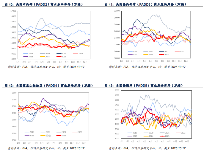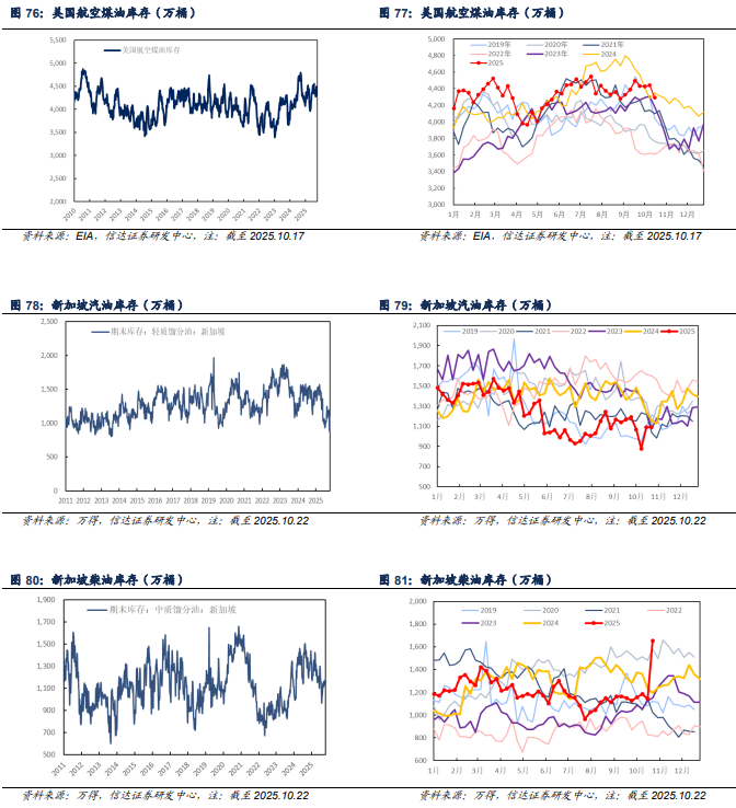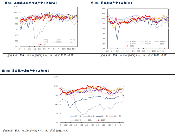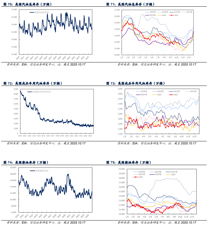 产量方面:截至2025年10月17日当周,美国成品车用汽油、柴油、航空煤油产量分别为959.4、463.2、164.3万桶/天,较上周分别+23.5(+2.51%)、+4.0(+0.87%)、-7.2(-4.20%)万桶/天。